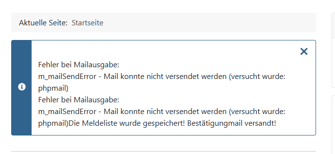 Nach Abgabe der Mannschaftsmeldung (wird korrekt gespeichert) wird eine Fehlermeldung ausgegeben (s. Anhang) und es erfolgt keine Mailzustellung oder (sporadisch) eine Meldung wegen Zustellfehler.