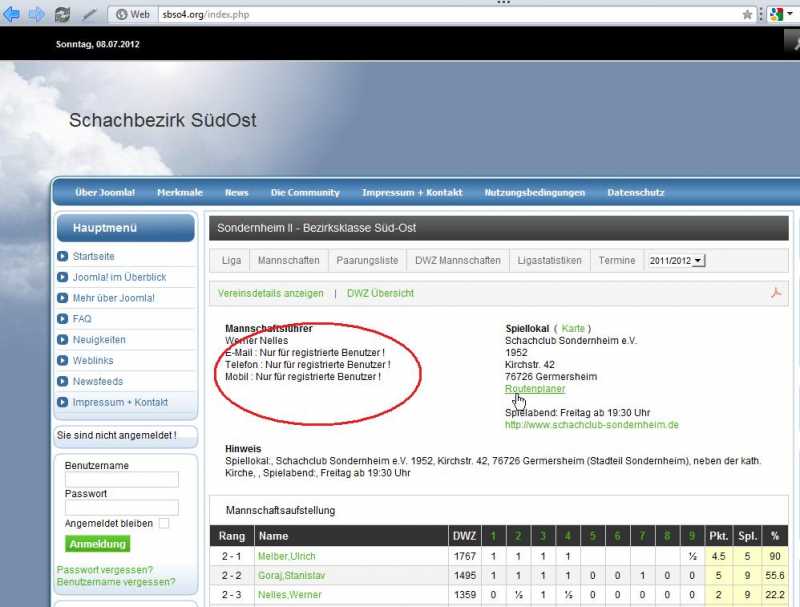 Mir ist auf der Seite des "sbos4.org" (siehe Bild) eine nützliche Funktion für den Schutz der Mannschaftsleiter aufgefallen. Email und Telfonnummern sind nur für registrierte Nutzer sichtbar. Ist das eine Sonderfunktion? Wenn ja, wie kann man das einstellen? Wenn nein, kann dies in die offizielle Version übernommen werden?