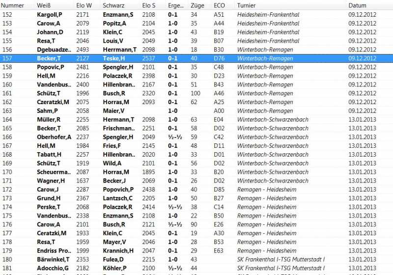 wenn dann in einer üblichen Liga am Ende alle Partien in PGN-Format in einer Datei vorliegen, so sind das 8 x 5 x 9 Partien. Also 360 Partien bei einer Liga mit 10 Mannschaften und 8 Stammspielern und 9 Runden.