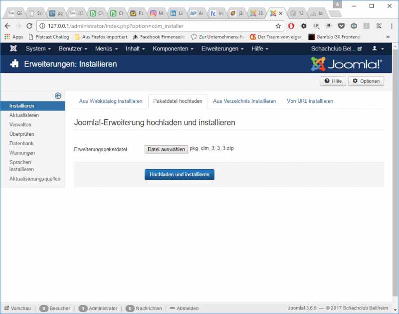 Ja, ich habe das CLM-Komplettpaket pkg_clm_3_3_3.zip downgeladet und dann über die admin-Konsole von Joomla über Paket hochladen installiert. Dort wurde mir sann auch ein positiver Vollzug bescheinigt. Es war eine Erstinstallation. Danach bin ich über Komponenten -> ChessLeagueManager -> com-clm-clm auf die Komponente gegangen und erhielt besagten fehler, dnach habe ich natürlich nochmals alles deinstalliert, über die Verwaltung und habe CLM deinstalliert und es anschliessend nochmals versucht. Das Ergebnis war dasselbe. Habe 3 Screenshots angehangen.