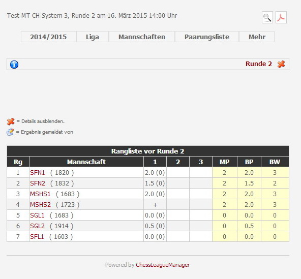 2) für den Live-Modus muss dringend eine Berechnung der nächsten Runde eingebaut werden, wenn man den CLM z.B. ohne swiss-chess verwenden möchte. Die nächste RUnde sollte erst dann ermittelbar sein, wenn alle Ergebnisse der vorherigen Runde eingetragen sind und die Runde freigegeben wurde. Zum Vergleich: im ET kann man zumindest manuell Paarungen im CH-System nachtragen, was aber auch nicht schön ist (dazu gibt es einen weiteren Thread)