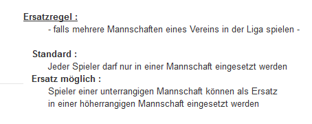 - Hat ein Verein mehrere Mannschaften (bei uns max. 2) in einer Liga, darf ein Spieler nur in einer Mannschaft dieser Liga (egal ob als Stamm- oder Ersatzspieler) aufgestellt werden.