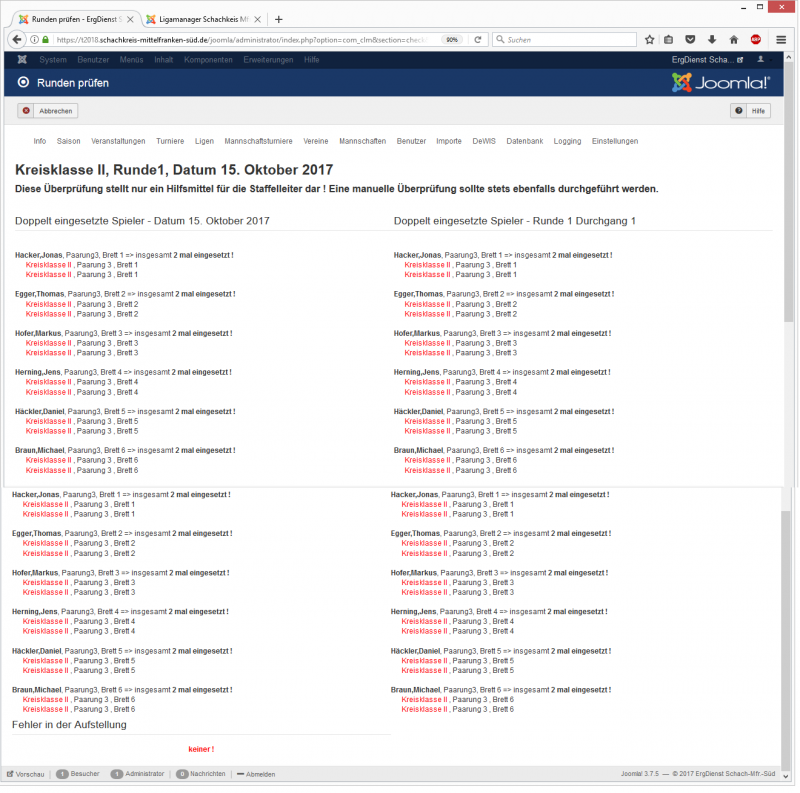 Mir ist nicht klar, wann die Ersatzregel greift. Ich habe (Ersatzregel: Standard) in einer Liga für zwei Mannschaften eines Vereins die identischen Meldelisten (im FE)abgegeben. Sie wurden anstandslos angenommen. Danach habe ich Ergebnisse eingegeben (im BE) und im Rundenmanager "Runde prüfen" aufgerufen. Es wurde gemeldet: Fehler in der Aufstellung: keiner ! Die doppelte Aufstellung der Spieler wurde gemeldet.