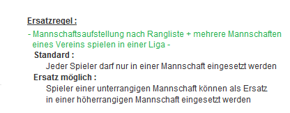 - wie mir scheint lässt eure TO generell Ersatzspieler aus anderen Mannschaften zu (nur nicht wenn die Mannschaften in derselben Spielklasse sind).