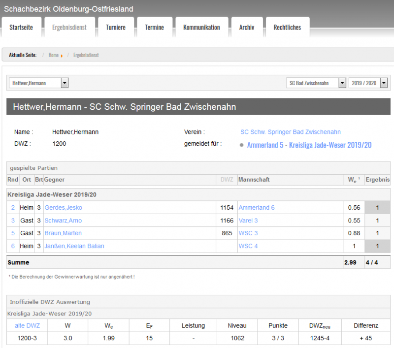 Das angefügte Beispiel aus Oldenburg-Ostfriesland zeigt: der Spieler hat 4 Partien gespielt, aber nur 3 davon gingen in die inoffizielle DWZ-Berechnung ein. Und das ist hier richtig, da der Gegner in Runde 6 keine DWZ hat bzw. hatte. In die inoffizielle DWZ-Berechnung gehen nur Partien gegen Schachfreunde mit DWZ ein. Die Vereinszugehörigkeit spielt keine Rolle.