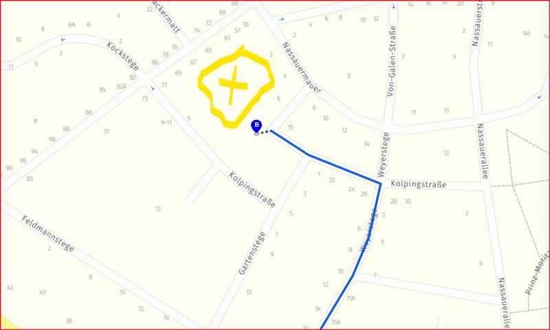 - die gelbe Markierung mit Kreuz wäre das Kolpinghaus.